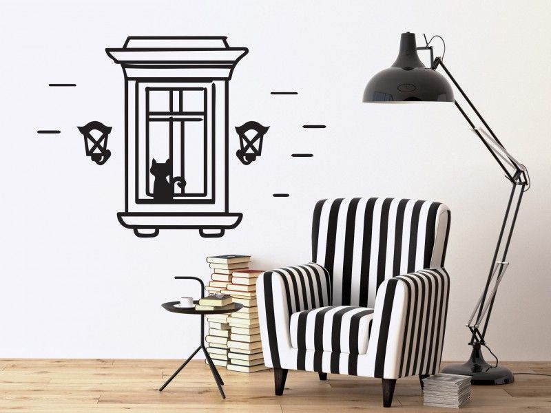O autocolante « Gato à Janela» é recortado na forma do desenho, sem qualquer contorno branco ou transparente para dar um efeito mais autêntico, aproximando-se muito de uma pintura real na parede.